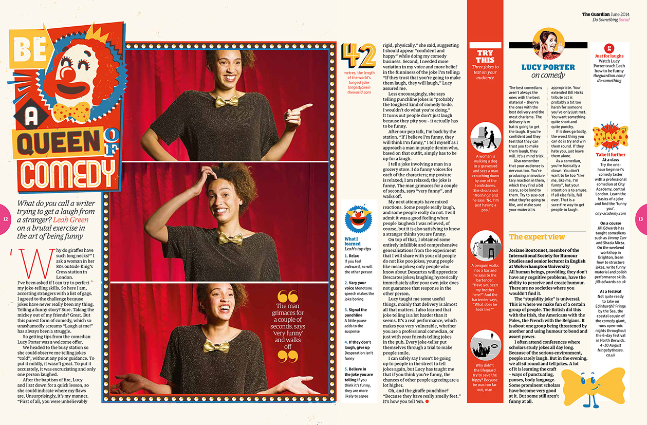 I was asked by the lovely people at The Guardian to come up with a cover, opener, page titles and a series of spot illustrations for the June 2014 issue of their 'Do Something' supplement. The mag teaches you how to perform comedy, sing karaoke, dance and generally be amazing.